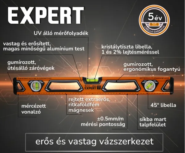 Az EXPERT Mágneses vízmérték a tartósság és a megbízhatóság szimbóluma. Vastagított, nagy szilárdságú alumínium váza kiválóan bírja az intenzív munkakörülményeket.