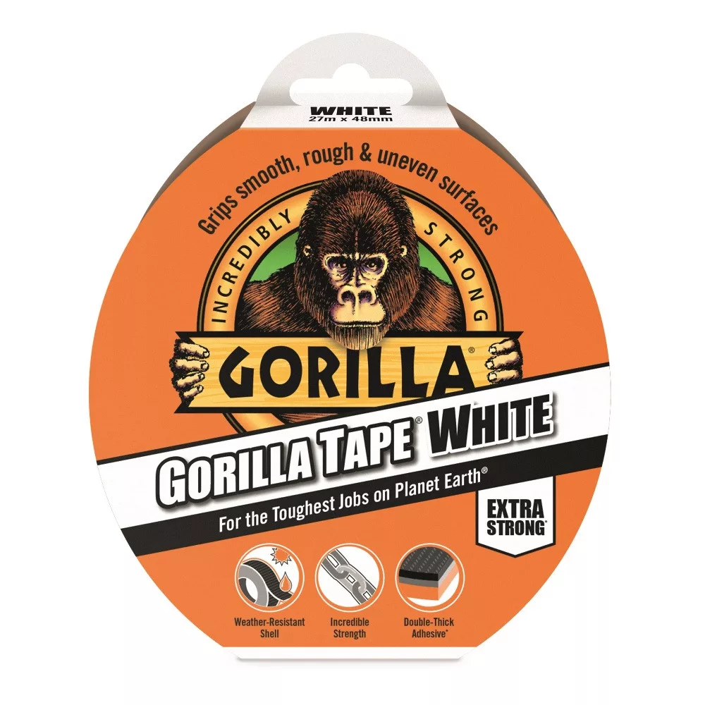 Gorilla Tape White 27 m x 48 mm a legendás ragasztószalag megnövelt hosszúságú, fehér színű változata, amely különösen praktikus hosszabb munkákhoz vagy ismétlődő használatra. Háromrétegű felépítése révén kivételes tapadást biztosít a legkülönfélébb anyagokon, mint a fa, tégla, gipsz, kő, fém vagy műanyag.