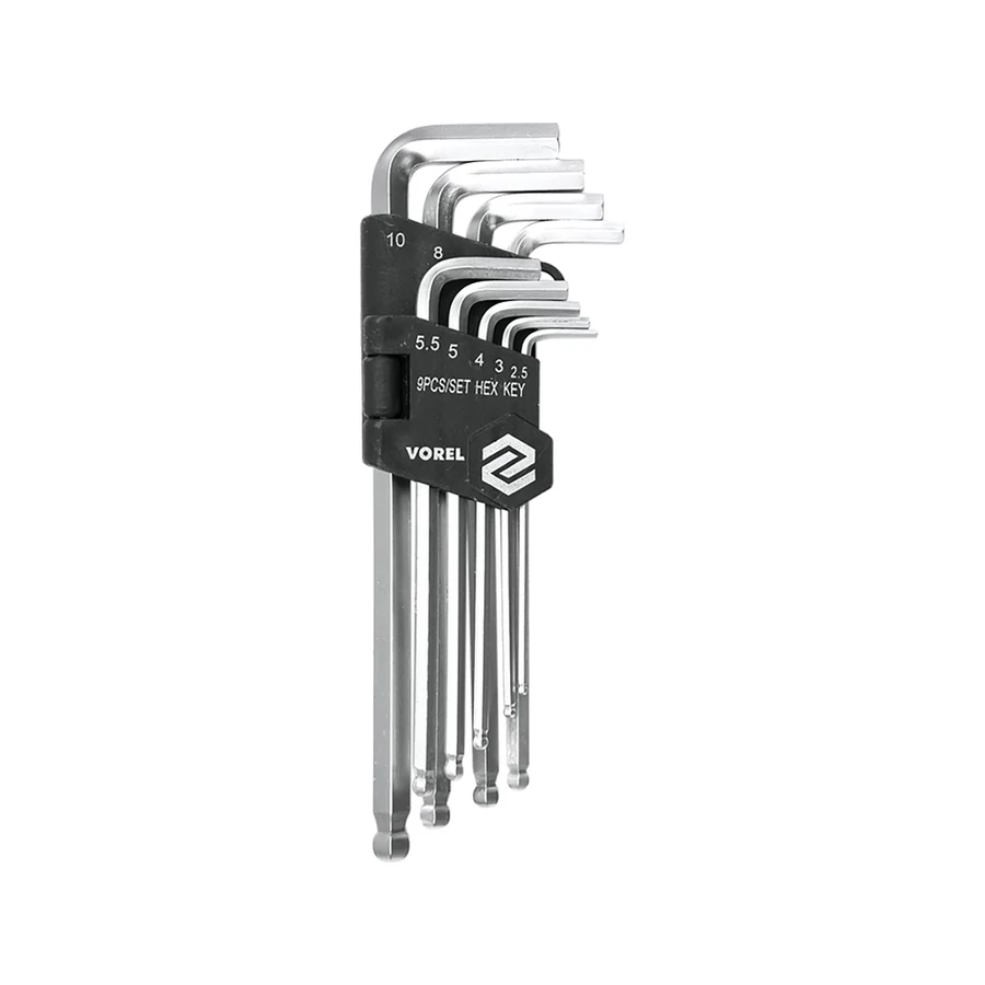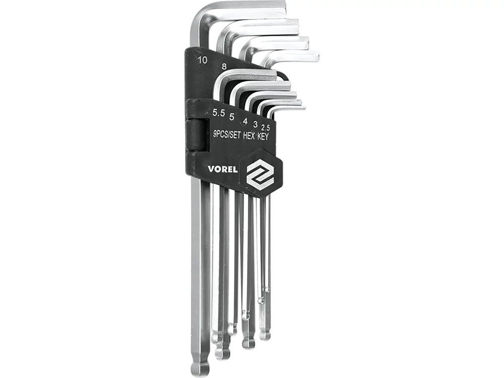 9 darabos, gömbfejes hatszögkulcs-készlet 2,5–10 mm mérettartományban, Vorel 56475. Tartós, króm-vanádium acélból (CrV) készült a nagy szilárdság és hosszú élettartam érdekében. A gömbfejes kialakítás akár 25°-os munkaszöget is lehetővé tesz a nehezen hozzáférhető kötéseknél. A készlet a következő méreteket tartalmazza: 2,5; 3; 4; 5; 5,5; 6; 7; 8; 10 mm. Az egyes kulcsok hossza: 84,5; 93; 103; 115; 122,5; 126; 145; 159; 175 mm; szélessége: 17,5; 20; 24; 27; 28,5; 29; 32; 35; 39 mm.